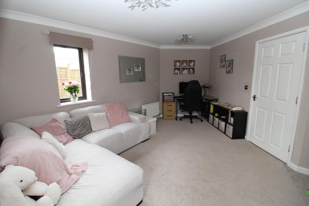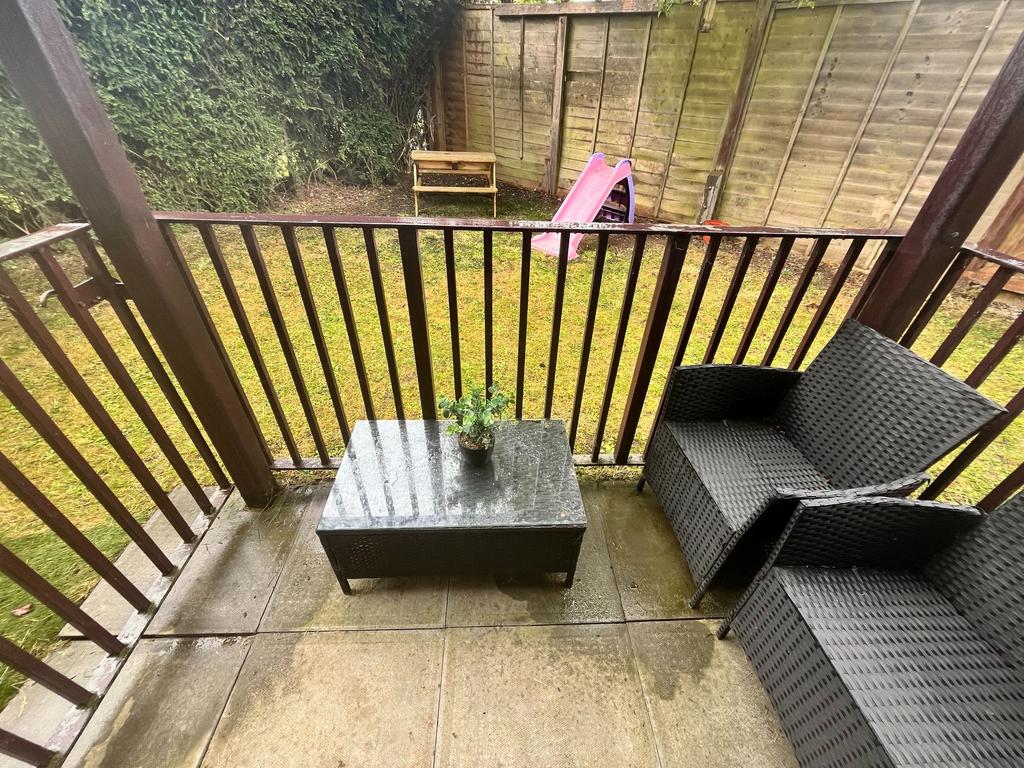 Of irregular shape, radiator, television point, window to side, door leading to patio area, which in turn has access to a communal garden area.