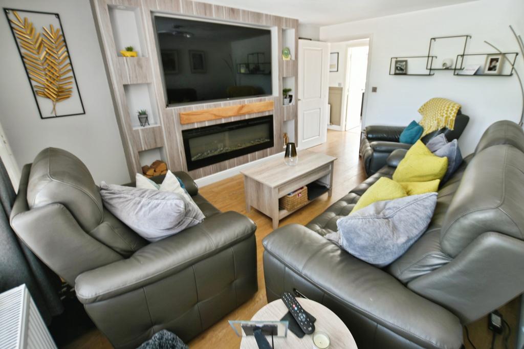 A spacious and beautifully presented living area with a front-facing corner bay uPVC double-glazed window fitted with venetian blinds. A standout media wall features inset display shelving and a modern electric flame fire, creating a contemporary focal point. Hardwood flooring continues throughout, complemented by stylish ceiling lighting. Door through to the inner hallway.