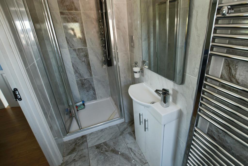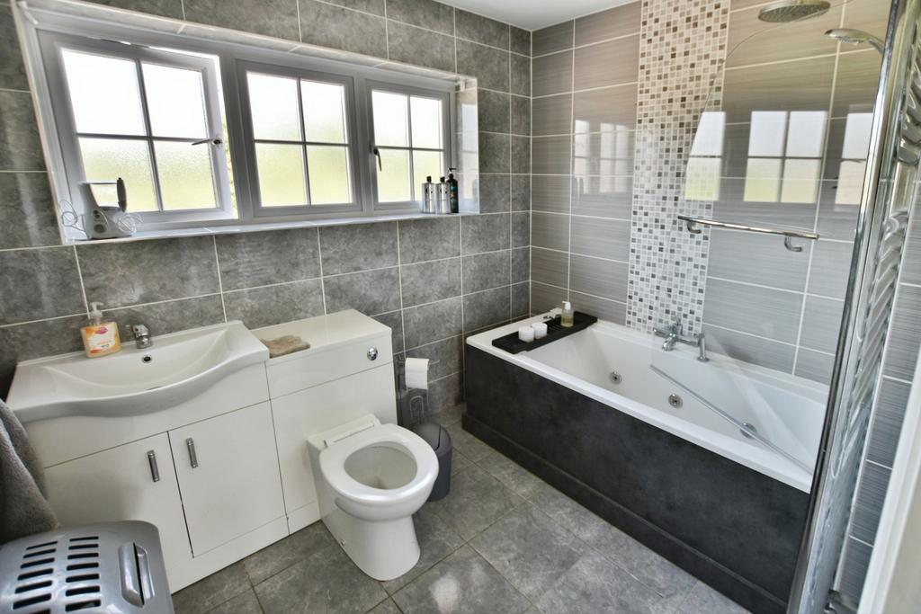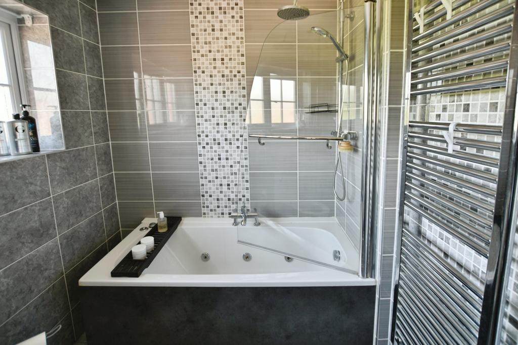 Elegantly styled and fully tiled throughout, the bathroom comprises an extended vanity unit housing a wash basin and integrated WC with push button flush. The spa-style bath features side water jets and a thermostatic overhead shower with dual shower heads. Front-facing privacy-glazed window, chrome radiator, recessed ceiling lights, and an extractor fan complete this luxurious space.