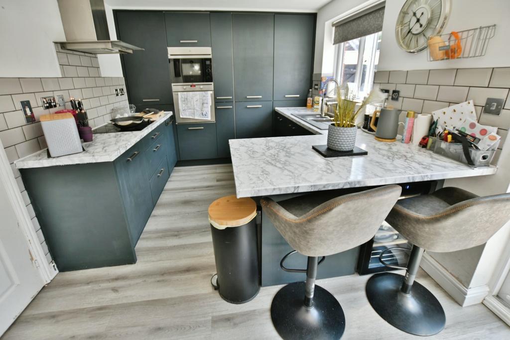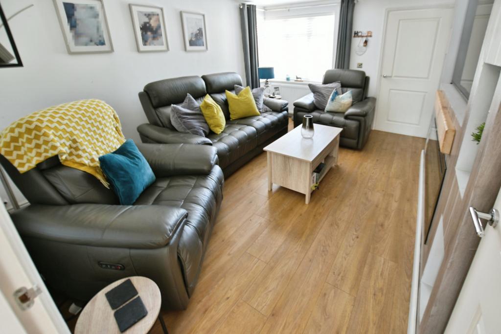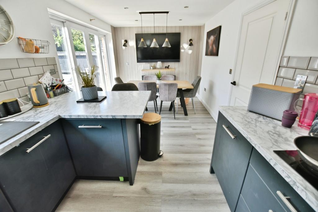 Spanning the full width of the property, this open-plan kitchen and dining space is perfect for modern family life. Rear-facing uPVC double-glazed window and French doors—with glazed side panels—open onto the garden. The kitchen boasts a comprehensive range of integrated appliances including a dishwasher, fridge-freezer, oven, microwave, wine chiller, and a gas hob with extractor. A one-and-a-half sink with mixer tap is set beneath the window. Contemporary charcoal radiator, grey laminate flooring, and recessed lighting complete the room.