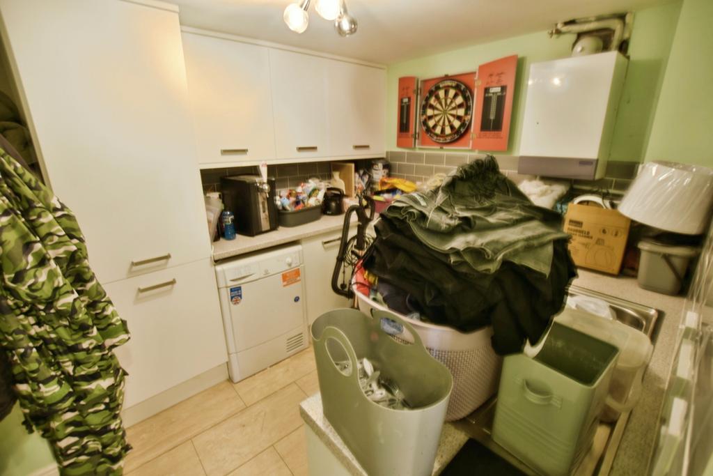 This generous and cleverly divided space includes a coat and storage area as well as a fully functional laundry zone. Fitted with a range of wall and base units, tiled splashbacks, and under-counter plumbing for both washing machine and tumble dryer. Features include an inset sink with mixer tap, wall-mounted gas boiler, electric radiator, coat hooks, and twin spotlight fittings.