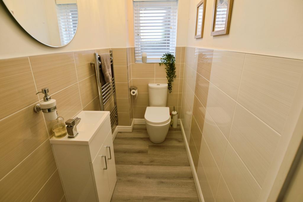 With a side-facing privacy-glazed uPVC window and venetian blind, this stylish cloakroom includes a low-level WC with push button flush, wash basin set into a vanity unit, vanity mirror, chrome radiator, and grey wood-effect laminate flooring. Half-tiled walls and a ceiling light finish the space.