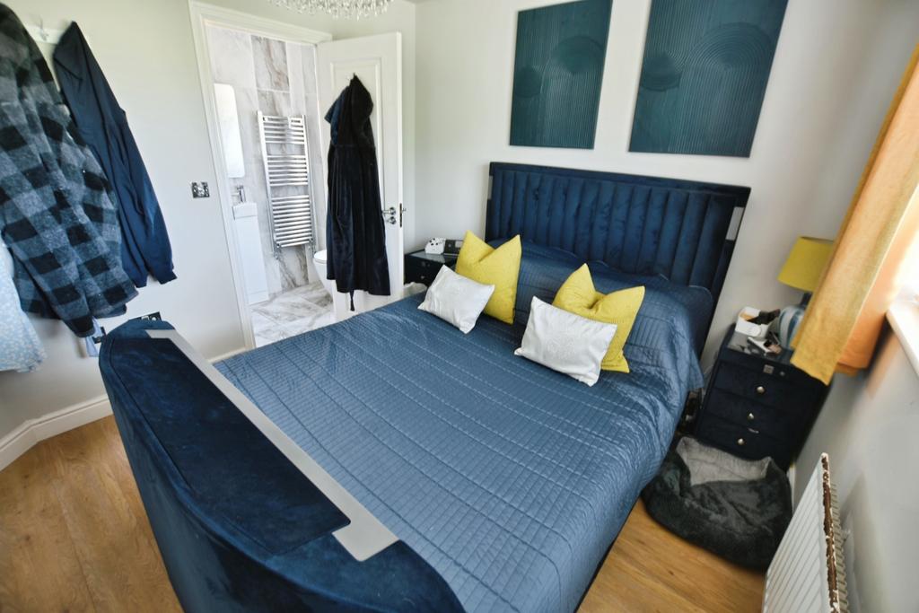 A serene and stylish bedroom with front-facing uPVC window and fitted venetian blinds. Mirrored sliding wardrobes offer ample storage, while hardwood flooring and a decorative ceiling light lend a polished finish. Internal door leads to the en-suite shower room.