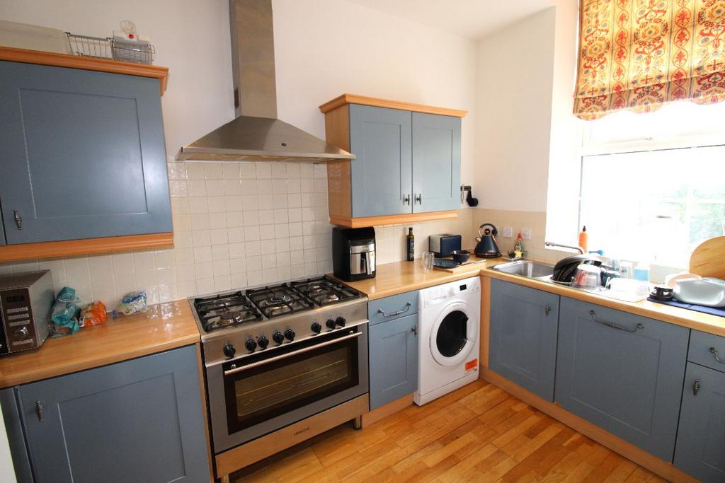 High, vaulted window to the front elevation. Recessed ceiling lights. Kitchen units to low and high levels. Work surfaces. Stainless steel single drainer sink with mixer tap. ‘Kenwood’ multi-fuel range cooker with overhead extractor hood. Tiled splash areas. Integrated dishwasher. Plumbing and space for washing machine. Integrated fridge and freezer. Radiator. Wood-effect laminate floor.
