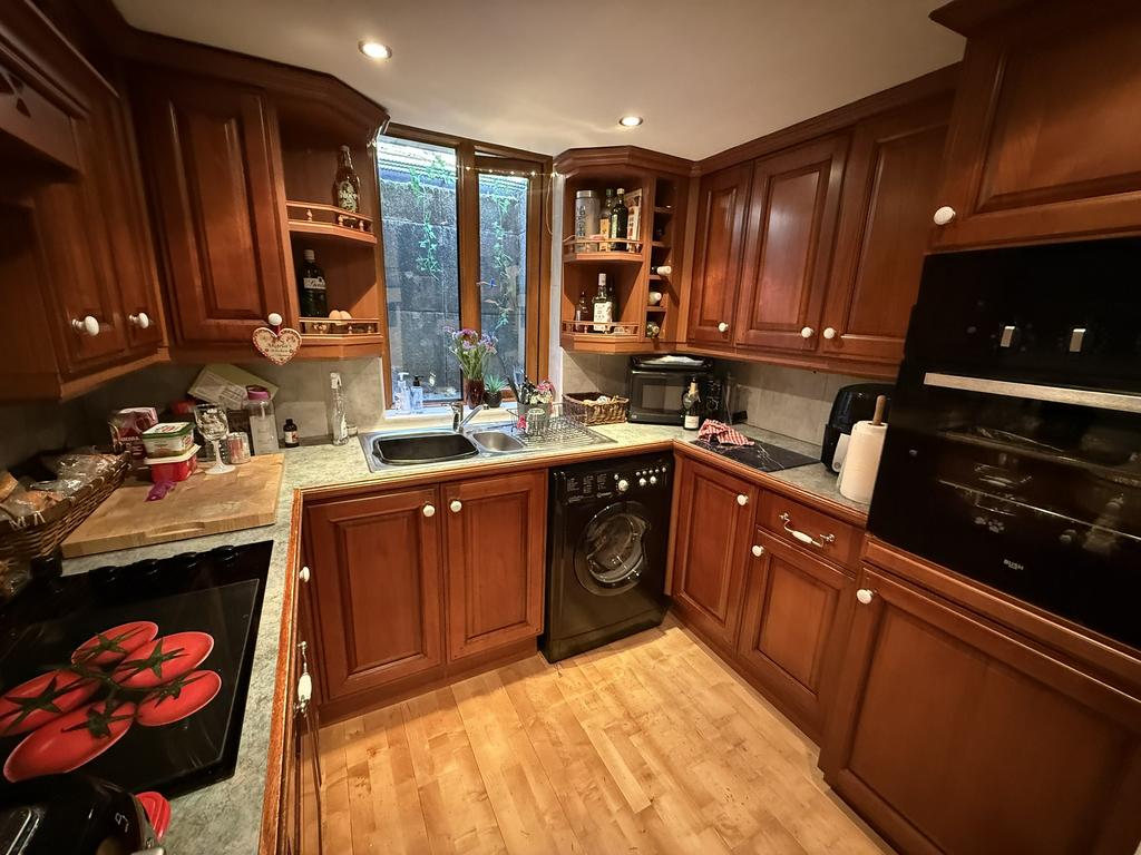 Base and wall units, 4 ring ceramic hob with filter hood over, 1 1/2 bowl and single drainer sink unit with mixer taps over, double glazed window to rear, appliance spaces, plumbing for washing machine, electric oven, timber flooring and integral lighting.