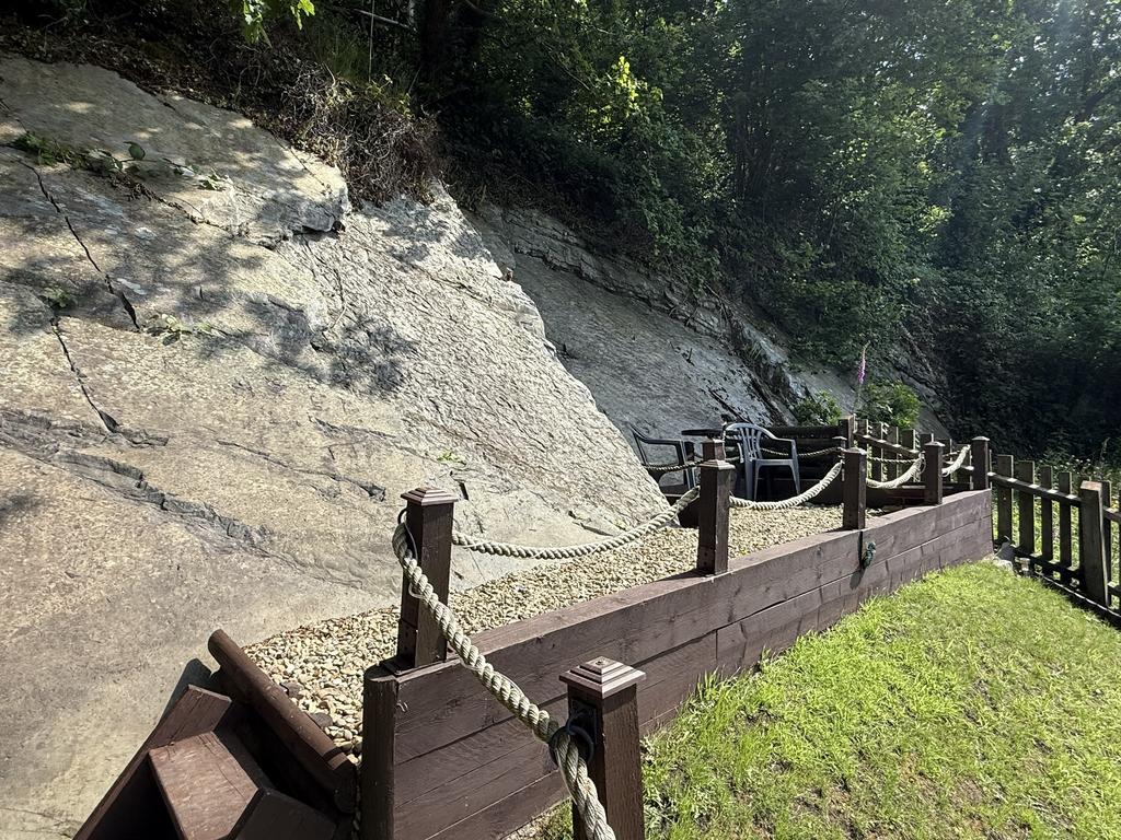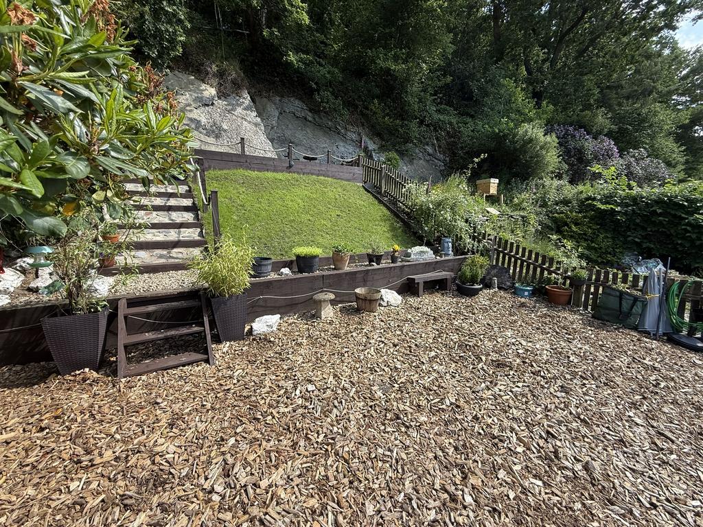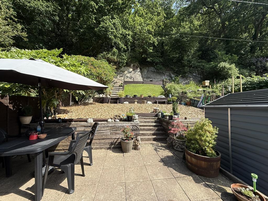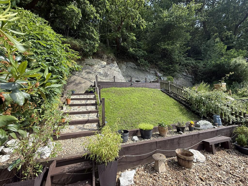 The rear garden is landscaped to take full advantage of its natural surroundings, with a striking bedrock terrace and the rare benefit of external access that does not require passage through the house. This outdoor space offers a peaceful, private retreat.