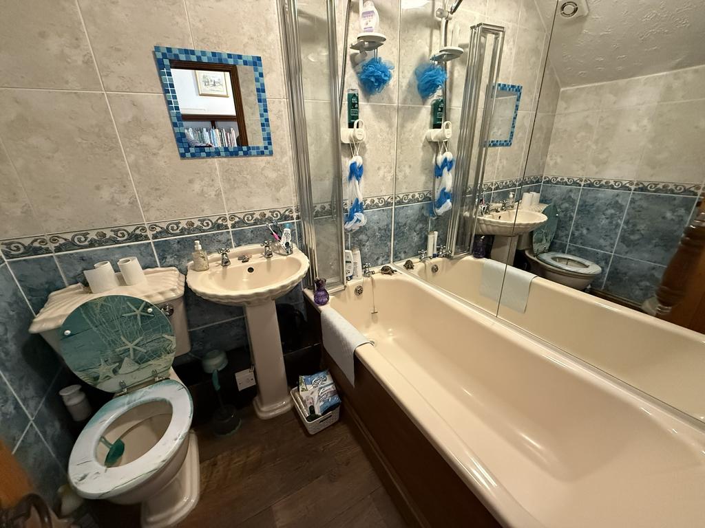 Panelled bath with ‘New Team’ shower over and glazed shower screen, large wall mirror, tiled walls, pedestal wash hand basin, low level flush WC and extractor fan.