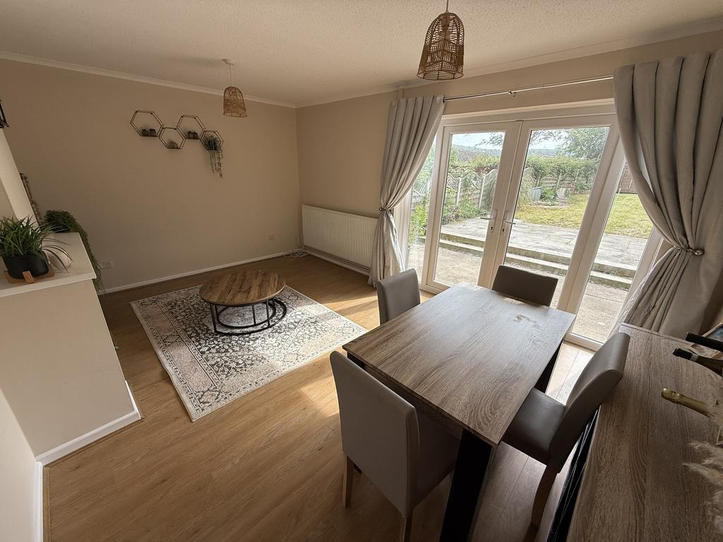Double glazed French doors to rear with double glazed side panels, laminate flooring, radiator, fireplace with timber mantle and coved ceiling.