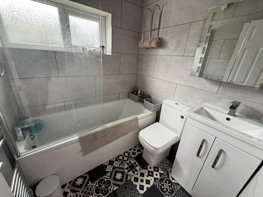 Vanity wash basin with mirror door medicine cabinet over, low level flush WC, panelled bath with ‘Triton’ shower and glazed shower screen over, Chrome effect heated towel rail, double glazed window to side and tiled walls.