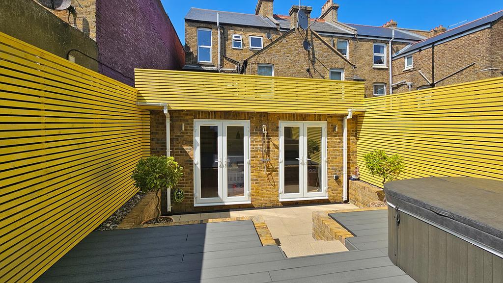 Recent improvements by the current owner include the installation of a new consumer unit and soundproofing to the ceiling, adding both comfort and peace of mind. The main bathroom is modern and well-sized, providing a sleek, comfortable space. To the rear of the property are two bedrooms, with the second bedroom benefiting from its own en-suite shower room. Both rooms offer direct access to a private rear garden, which enjoys a sunny aspect. The garden is a true highlight, featuring an external shower and a luxurious hot tub—perfect for unwinding after a long day.