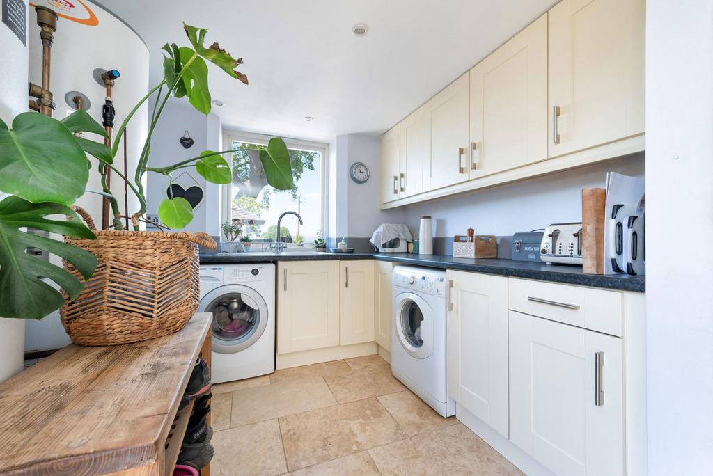 Having a range of base cupboards and drawers with worktop surface over, matching wall units, inset single drainer sink with mixer tap over, plumbing installed for an automatic washing machine, space for tumble dryer, water tanks heated via the solar panels, double glazed window and door giving an outlook and access to the rear garden.