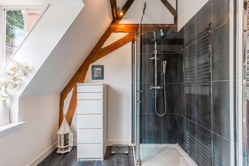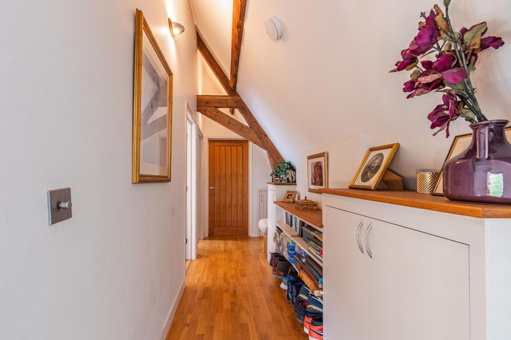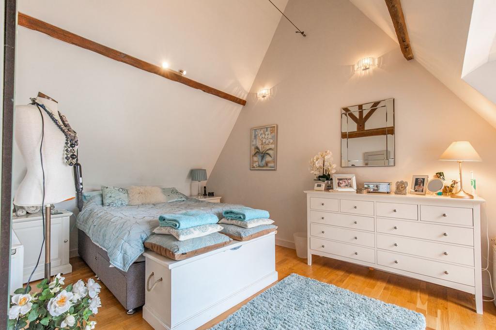 To the first floor, two generous double bedrooms are found, with one currently serving as a charming twin room. The striking principal bedroom enjoys all the drama of the fully vaulted ceilings and exposed timbers as well as a Juliet balcony to swing open and beckon in the fresh riverside air. Both bedrooms are well served by the luxurious family shower room.