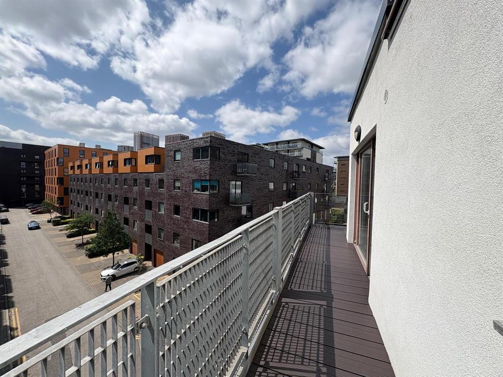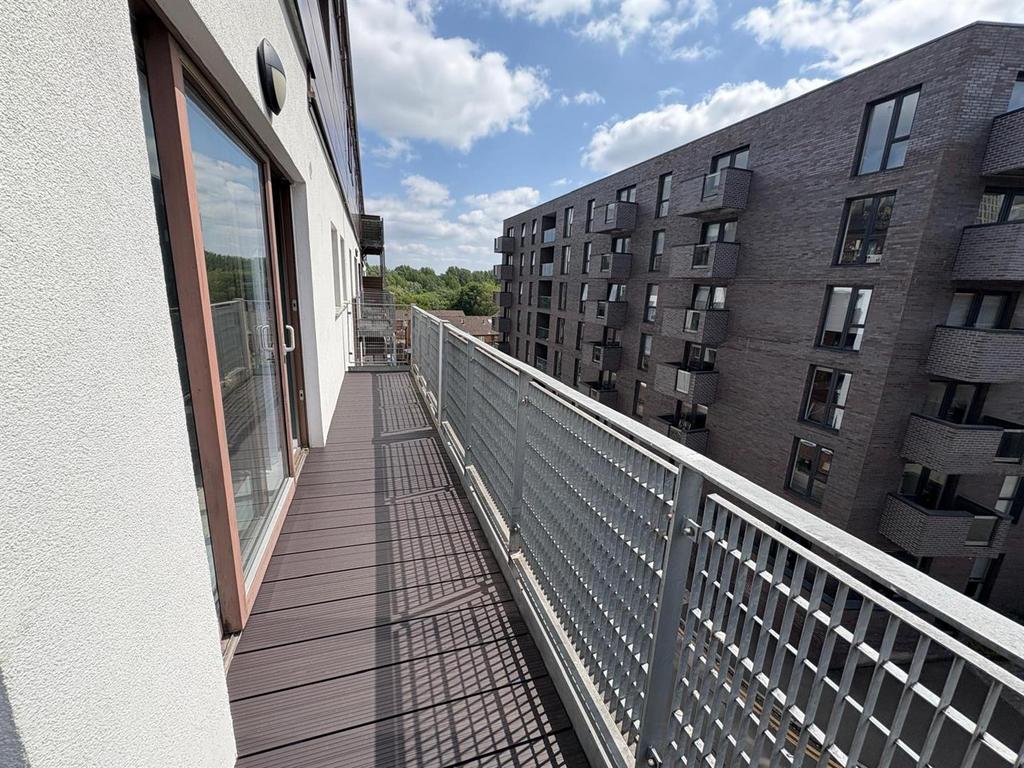 Externally - Superb corner balcony with views over the entrance of the development.