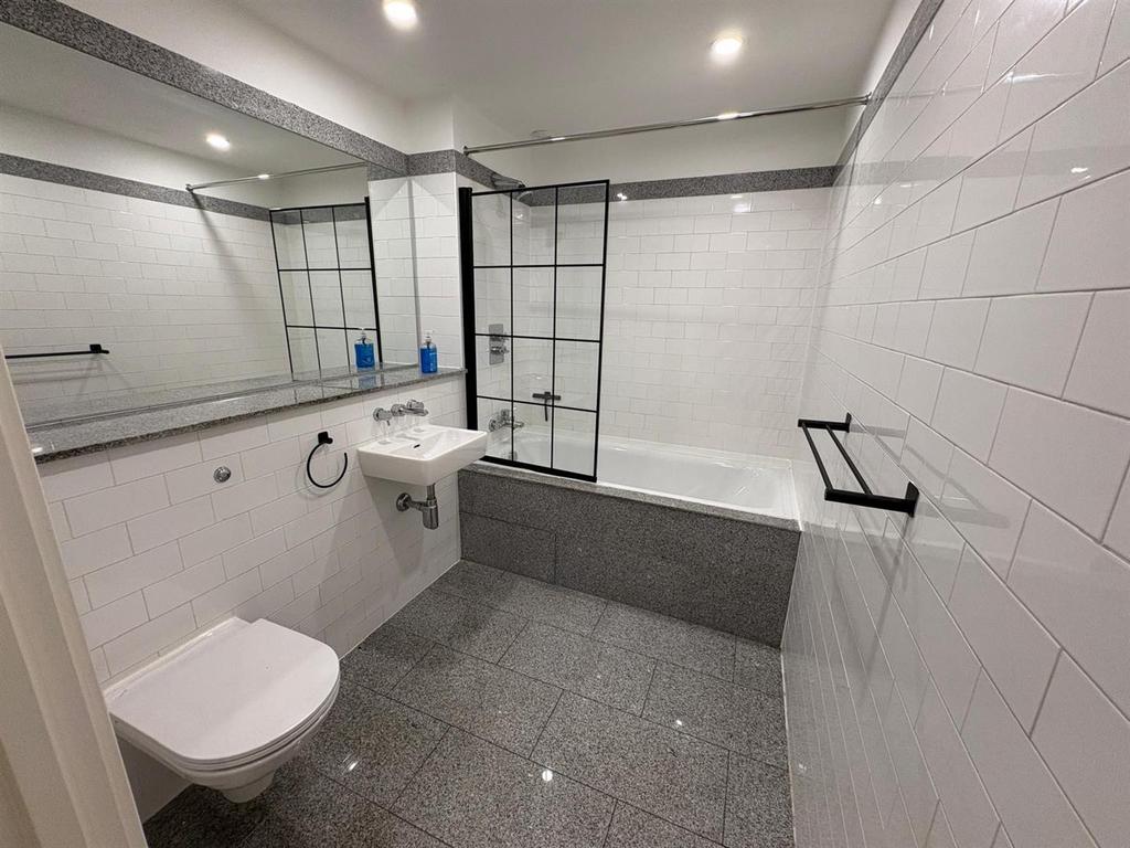 Bathroom - 2.61 x 1.69 (8'6" x 5'6") - Fully tiled. Bath with mixer shower over. Sink with mixer tap. Low level W/C. Heated towel rail. Tiled walls and floor.