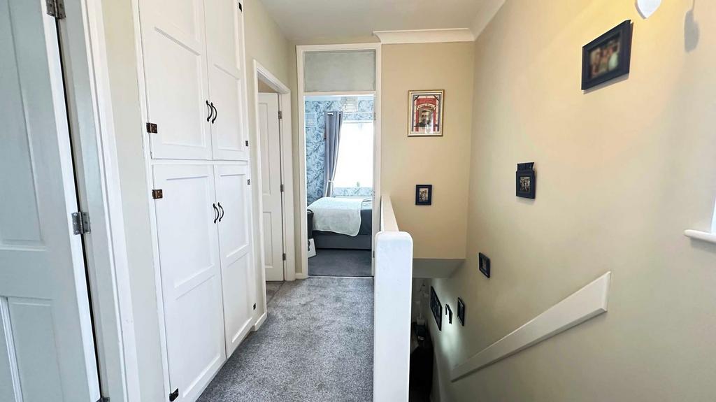 First Floor Landing – Double glazed window to side, fitted carpet, access to loft with ladder, lighting and part boarded, large storage cupboard