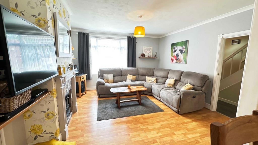 Entrance Hall – Double glazed door to front, laminate flooring, 1 x radiator in radiator cover, under stairs cupboard
