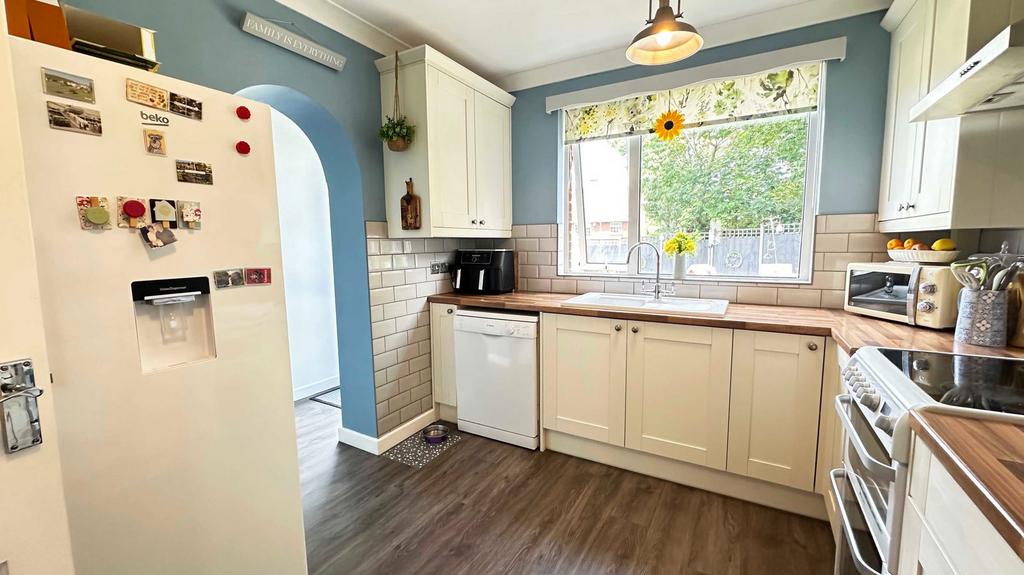 Kitchen – 11’ x 9’4” – Double glazed window to rear, archway to inner hallway, range of fitted modern wall & base units with work tops, sink & drainer, local tiling, laminate flooring