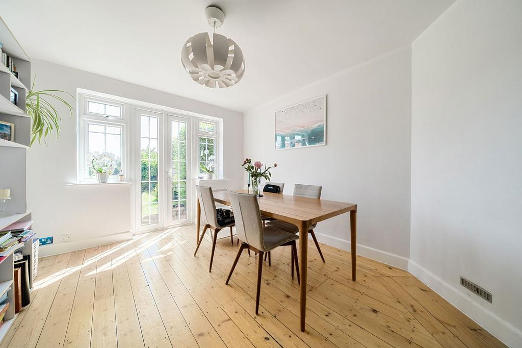Step inside through the porch and into a generous hallway where the original layout begins to reveal its thoughtful design. To one side, a charming front-facing reception room features a bay window and working fireplace, flowing naturally through to the dining room at the rear. With French doors opening directly to the garden and wooden flooring underfoot, it’s an ideal space for both family gatherings and quiet evenings in. Opposite, a versatile second front room currently serves as a store and occasional bedroom, but could just as easily be a playroom, snug, or large home office.