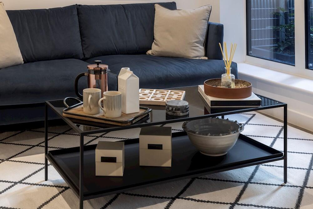 Light and spacious with floor to ceiling windows and blinds. Plush 2-seater sofa, media storage unit, and coffee table.