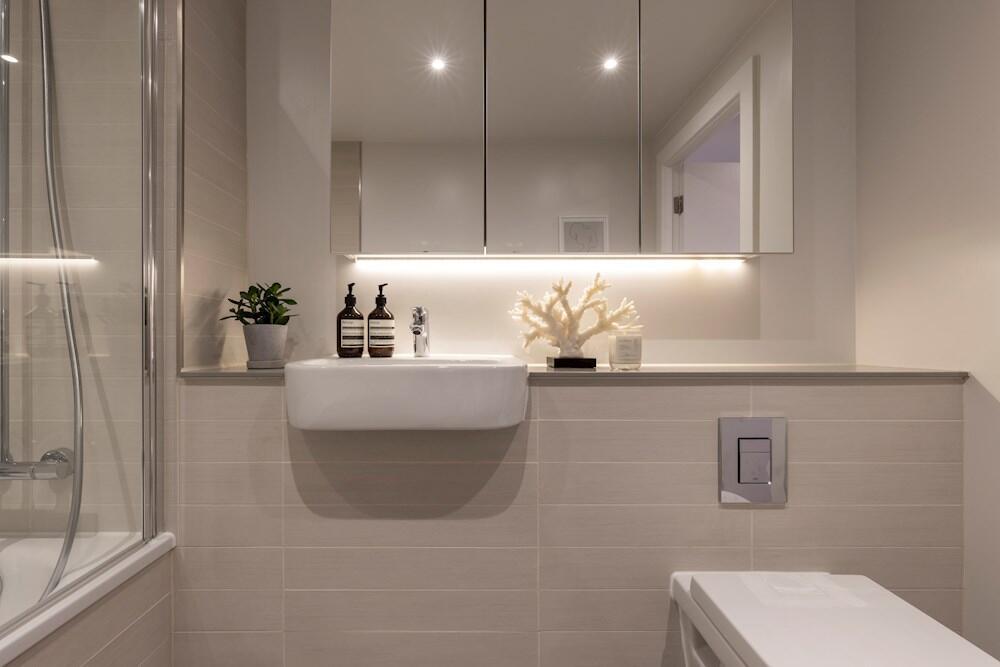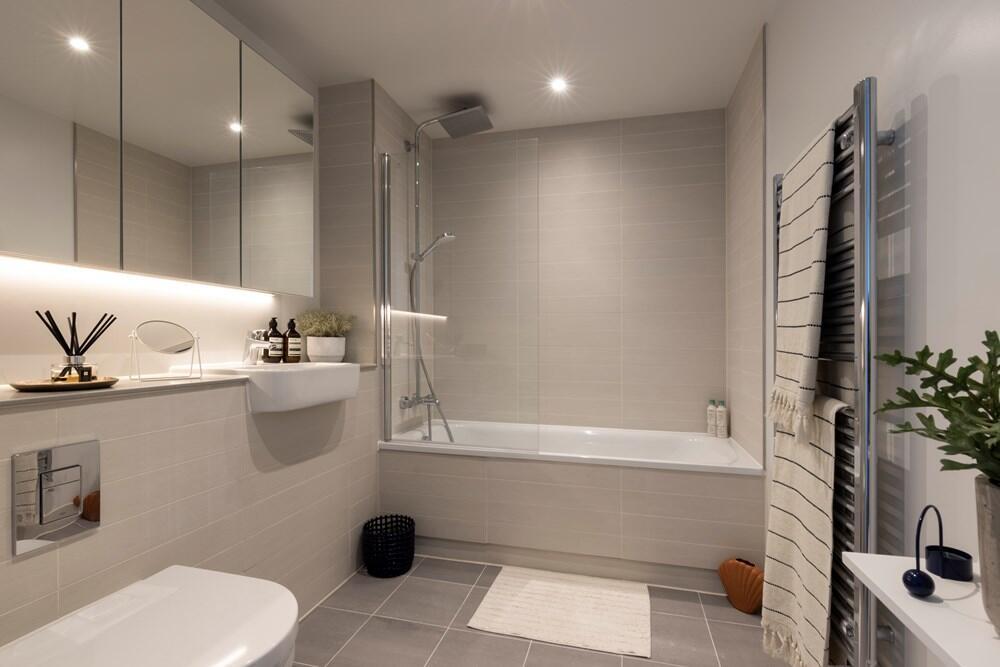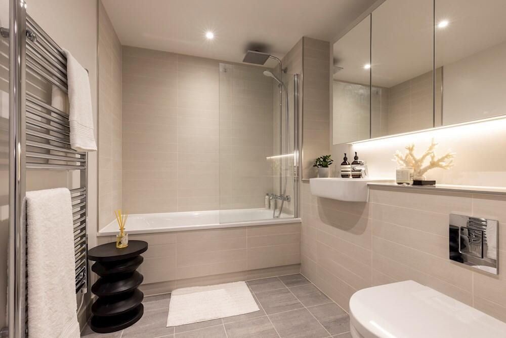 Bathroom with contemporary tiling throughout. Bathtub with shower, WC and heated towel rail.