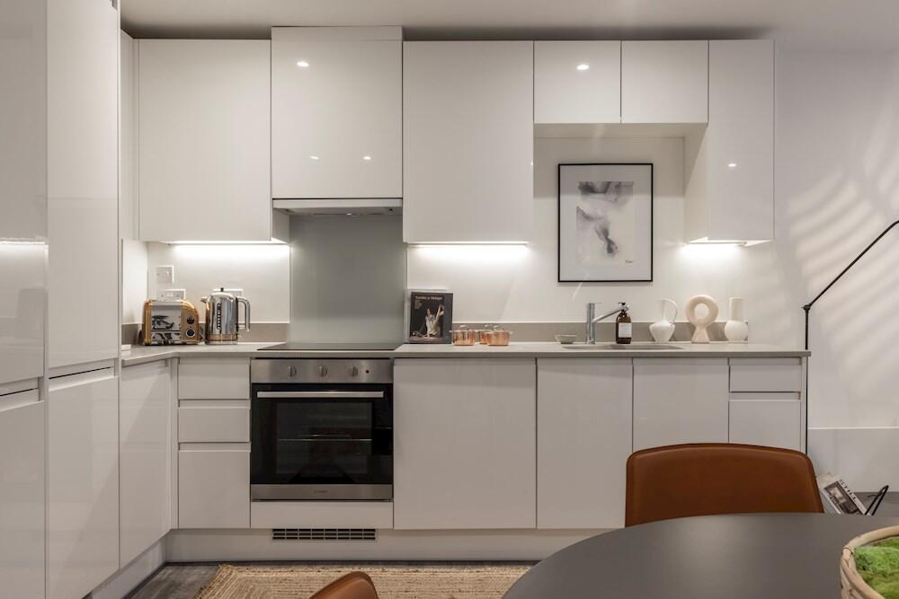 Open plan, sleek and modern Indesit appliances including electric hob and oven. Includes integrated fridge freezer, dishwasher, and a washer/dryer tucked away in a laundry cupboard. Room to dine with dining table and four chairs.
