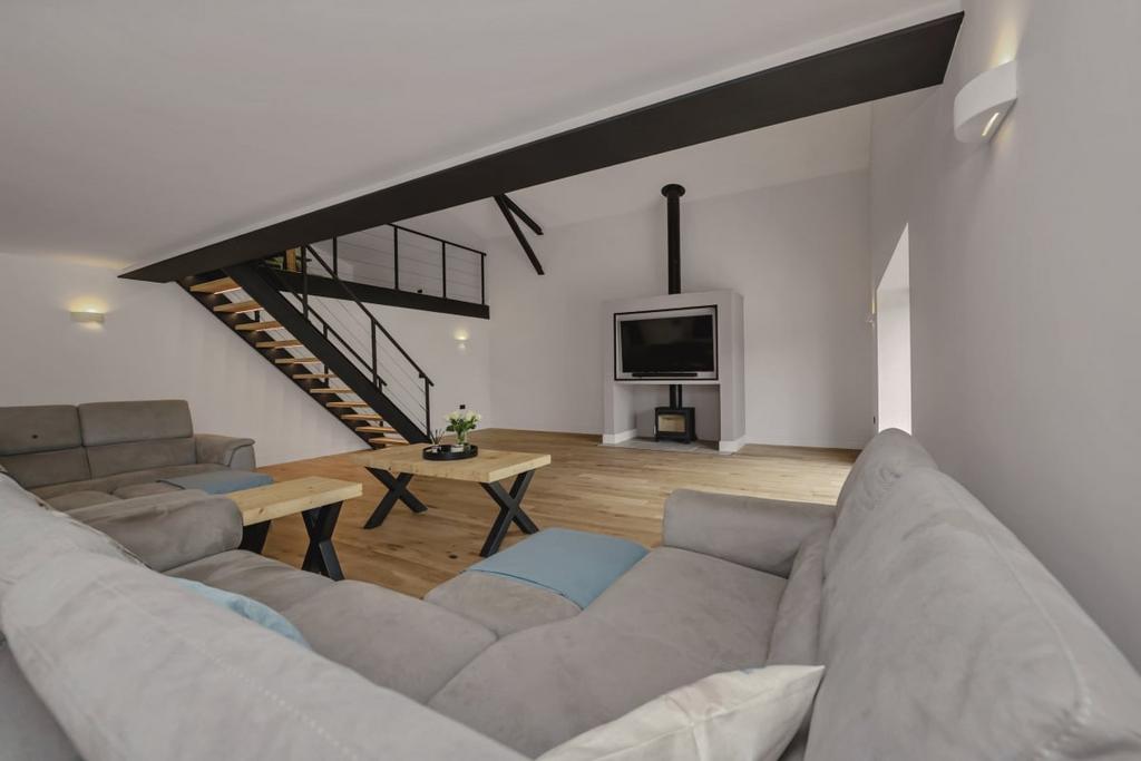 This open plan living area offers large sofa area, wood burner, dining room table, day sofas, kitchen with big island.