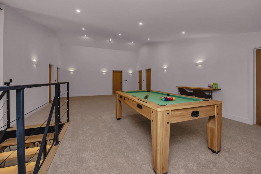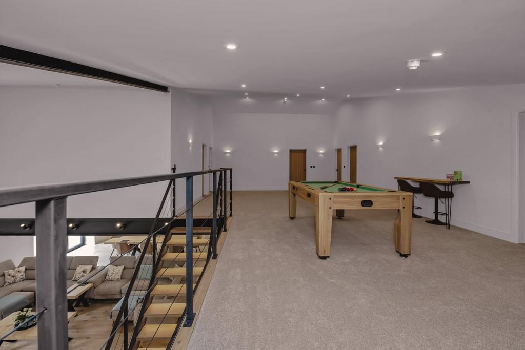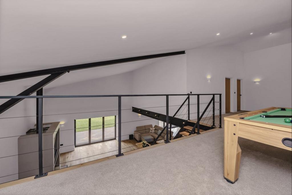 Spacious landing with games area, seating area, pick and mix counter and fridge outside cinema room. The landing looks over the lounge area.