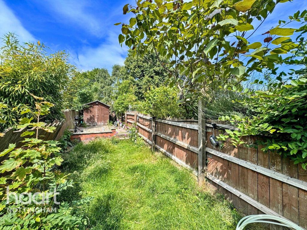 Enclosed private space, wooden fencing, grass area, paved patio with shed at end