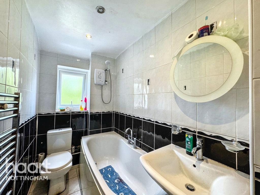 Tiled floors, tiled walls, WC, sink, bath/shower combi, heated towel rack, uPVC double glazed frosted window to rear elevation