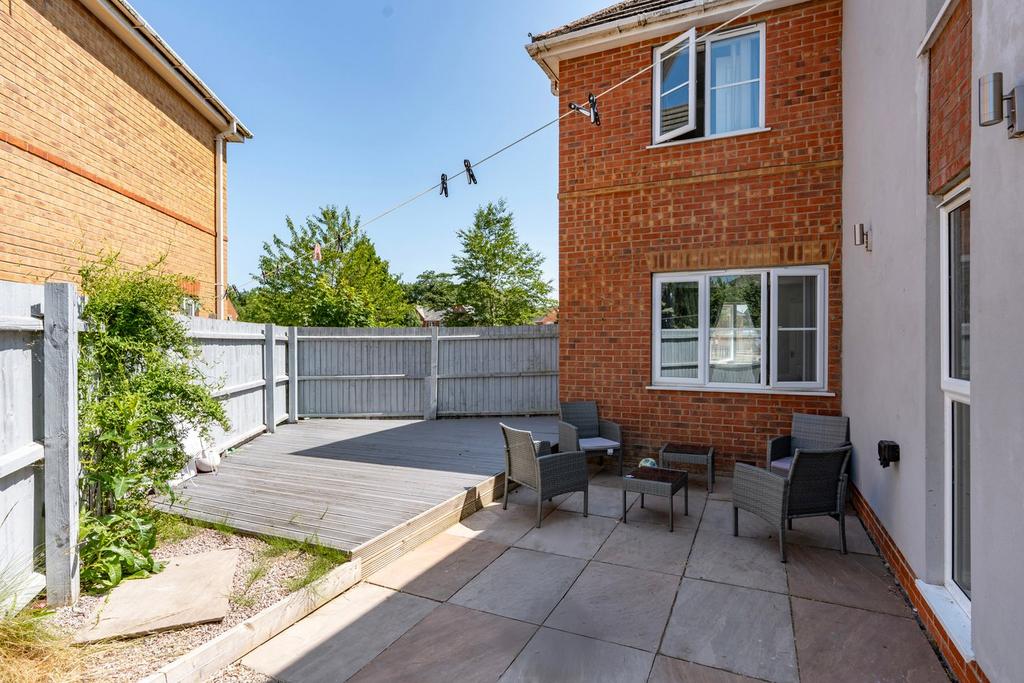 Being initially laid to raised decked and paved patio seating areas leading to a shaped lawn area and further artificial turfed area. The garden houses the external oil tank which is situated to the rear of the garage and concealed by fencing.