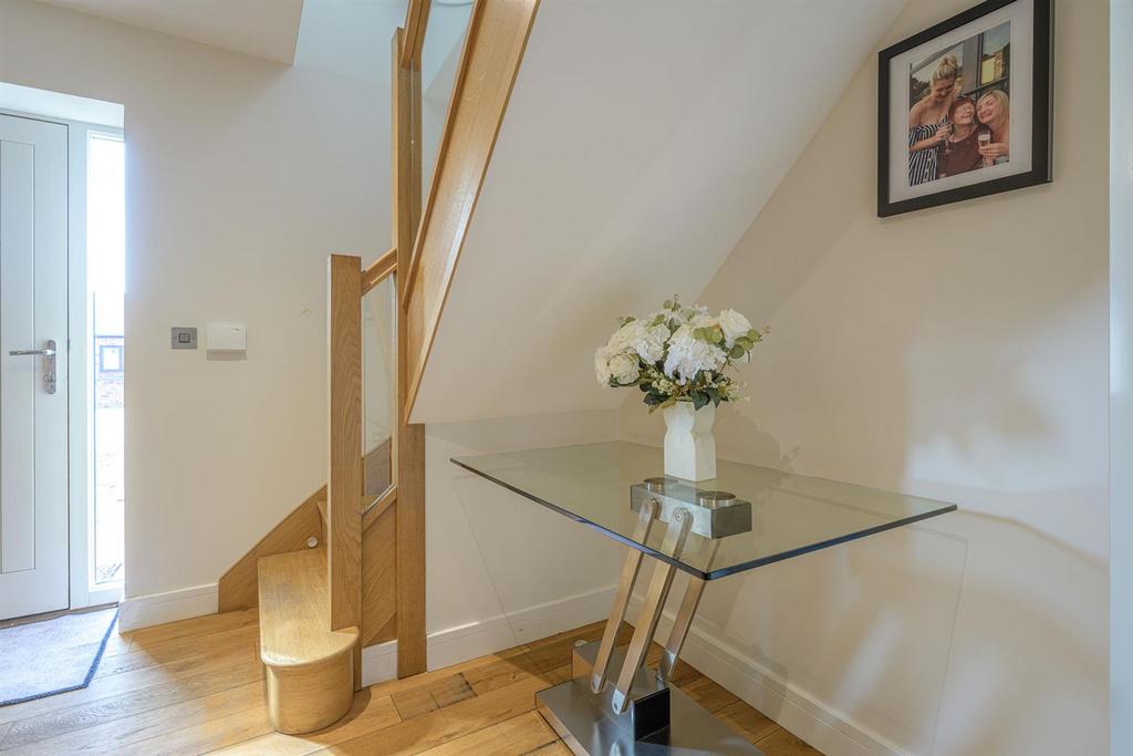 Reception Hall - 4.22m x 3.35m (13'10" x 10'11" ) - With a double glazed composite door leading from the front of the property, oak staircase, glass balustrade, doors to various rooms, recess spotlights, storage cupboard housing central heating boiler, wooden flooring and central heating radiator.