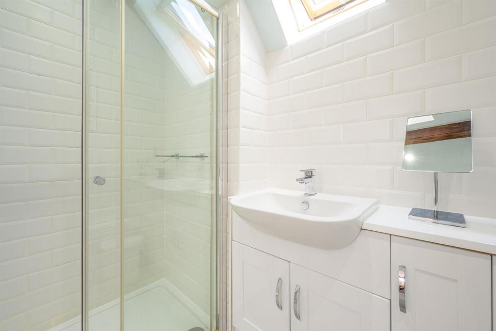En Suite - With a door from bedroom, WC, wash hand basin set into vanity unit, walk-in shower, tiled walls and flooring, feature oak beam, shaver point, recess spotlights, skylight and chrome central heating towel rail.