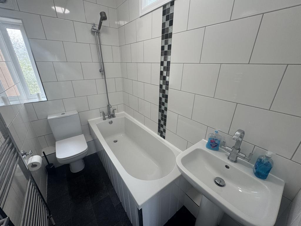 Bathroom. UPVC Double glazed window to rear, heated towel rail, bath with over bath shower, low flush WC, wash hand basin.