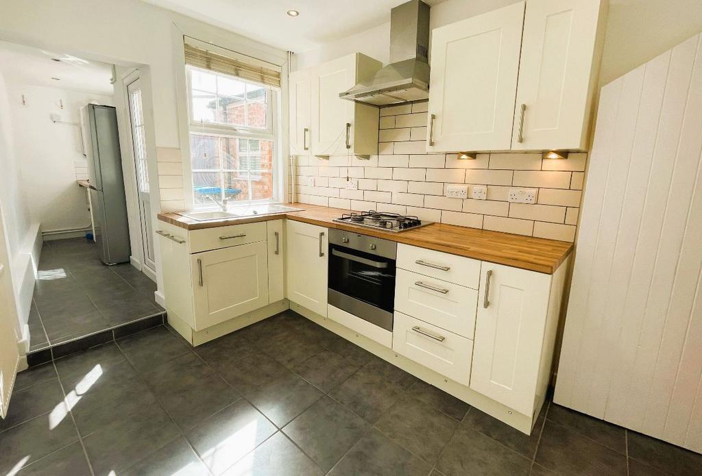 Refitted in shaker style units comprising single bowl and single drainer stainless steel sink unit with mixer tap and cupboard under. Further matching range of base and high-level units with complementary work surface areas and tiled splash areas. Built-in ‘Zanussi’ electric oven and gas hob with fitted cooker fan over. Tiled floor. Recessed ceiling lights. Double glazed window to the rear aspect. Open to: