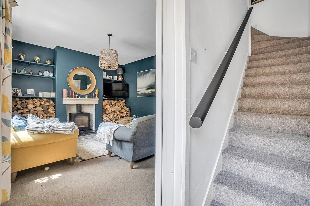 From the entrance hall, there are stairs that lead to the first floor and a door to the living room, where there is a log burner.