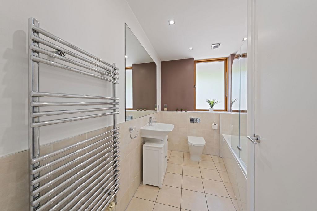 The bathroom is finished to a high standard with neutral tiling, a modern suite including a full sized bath with shower and glass screen, sleek vanity basin and chrome heated towel rail. A large frosted window keeps it light and fresh.