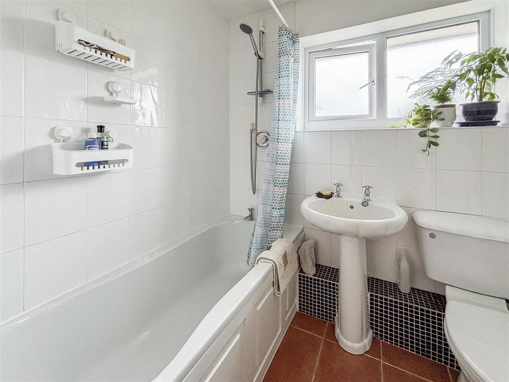 Family Bathroom - Low flush WC, pedestal wash hand basin and panelled bath with mains-powered shower over. Heated towel rail, ceiling light, uPVC glazed window to rear elevation. Tiling to wet areas and floor.
