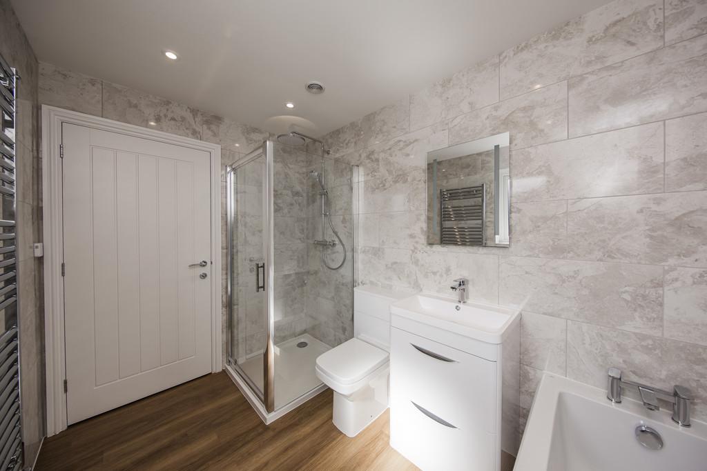FAMILY BATHROOM: Fully tiled corner cubicle with Mira rainfall shower and additional handheld shower attachment, panelled bath with mixer tap, low level wc, rectangular sink with mixer tap set into a vanity unit with drawer storage below and sensor mirror above. Electric chrome heated towel rail, Amtico flooring, extractor fan and fully tiled walling.