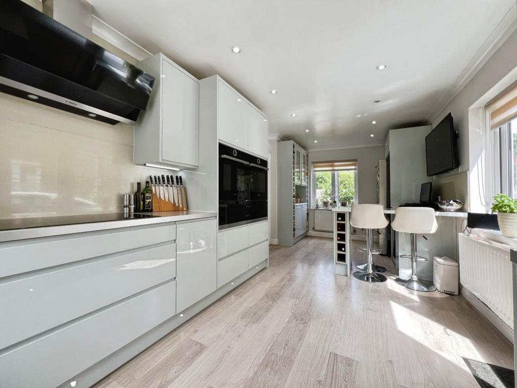 The accommodation boasts triple glazing throughout and offers a generous entrance hall with stairs to first floor and storage cupboard beneath with doorways leading to a cloakroom with WC and hand basin and a modern kitchen/breakfast room fitted with a range of stylish high gloss wall and base units with complementing stone worksurfaces, integrated dishwasher, dual ovens, induction hob with extractor above and space for fridge freezer.