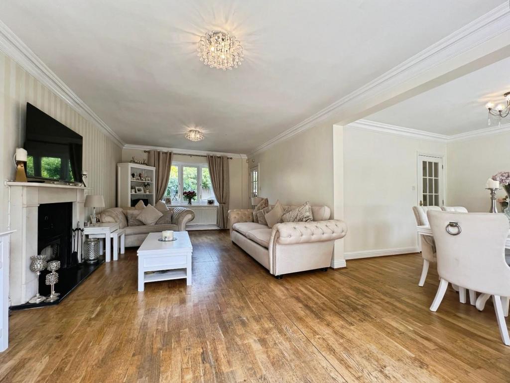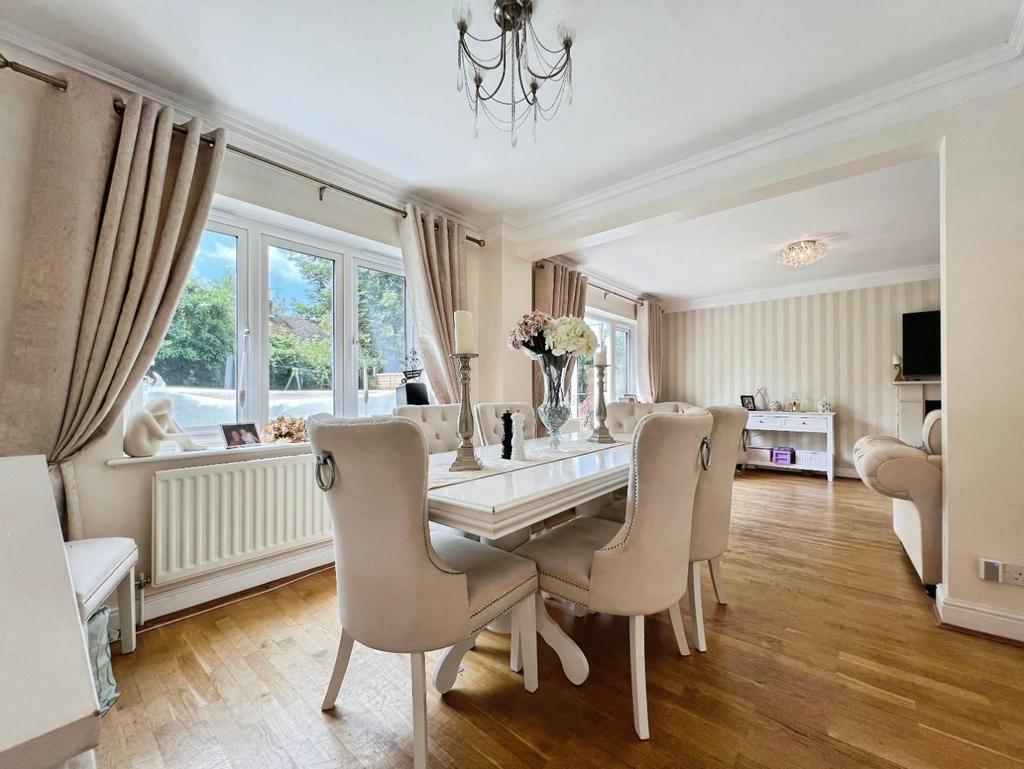 Externally, the property features an established garden with an abundance of mature trees, shrubs and flowering plants bordering the lawn. There is a side door offering access into the garage and a large patio area providing the perfect space for entertaining. To the front is a lawn area with ornamental trees framing the brick pillared porch, with driveway parking leading to the garage.
