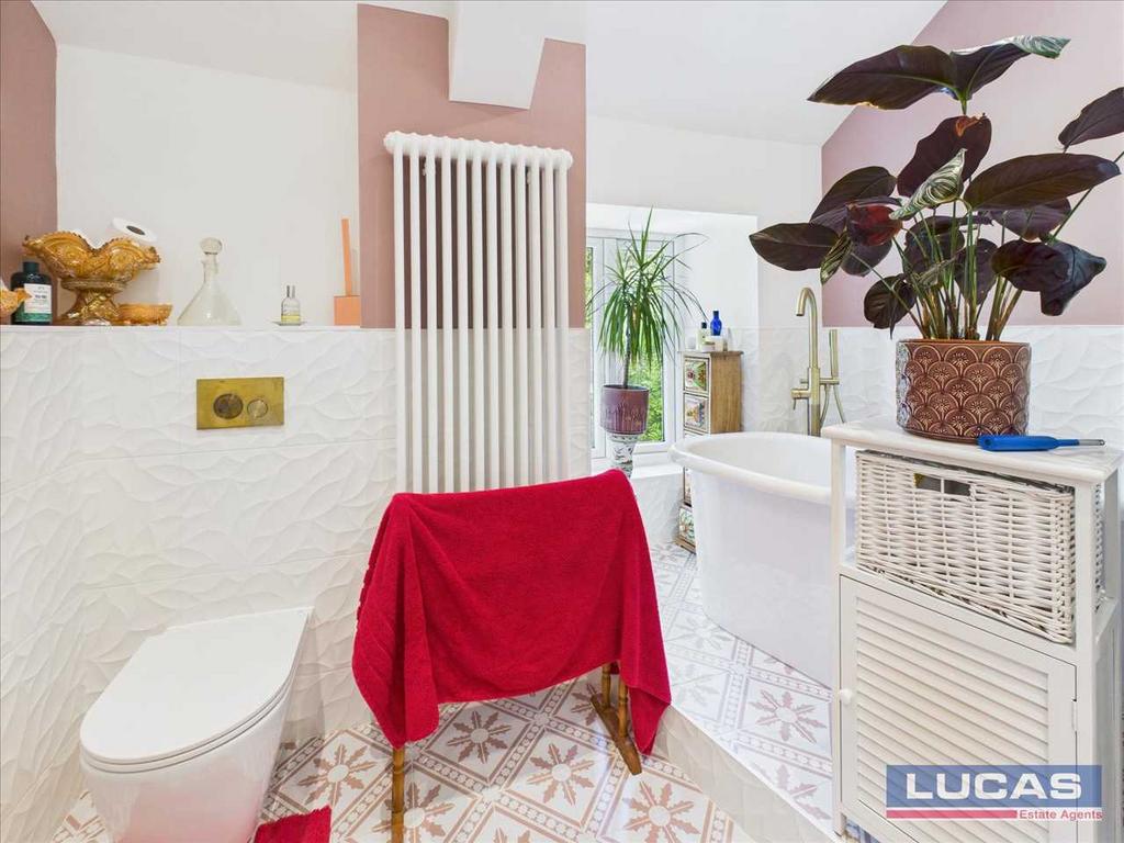 The first floor briefly comprises a generous L shaped landing with built in airing cupboard, window to rear aspect, access to loft space and doors leading off into L shaped bedroom 2 with exposed original timber beams, window to front aspect, Velux roof light, bedroom 3 with exposed original timber beams, window to rear aspect, Velux roof light, bedroom 4 with window to front aspect, Velux roof light and a newly fitted L shaped bathroom with sliding door and briefly comprising a slipper free standing bath, walk in mains operated shower with glass screen, cantilever vanity sink with round bowl and built in tap over, low flush Wc with built in push button flush over, vertical heated towel rail, complementary part tiled walls and tiled flooring, extractor fan, recessed lighting and double window to front aspect.