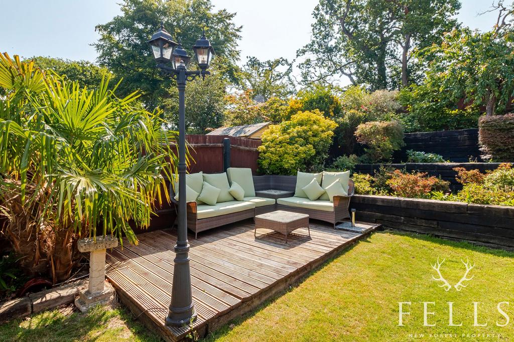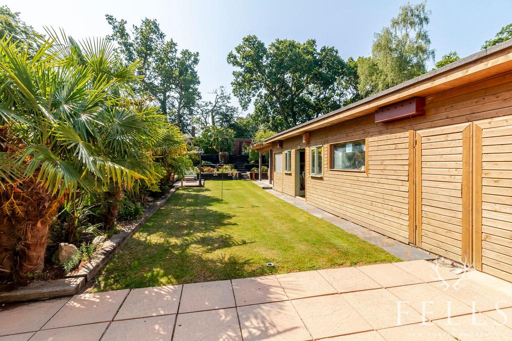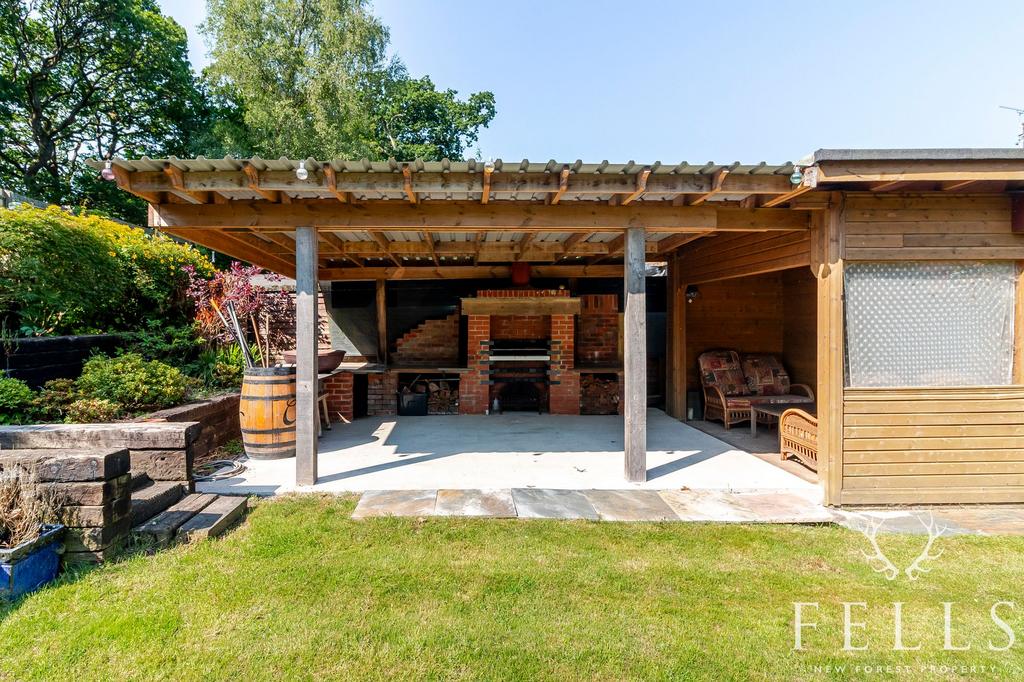 The 80ft south facing rear garden is well arranged for both relaxing and entertaining, with a lawned area, sleeper edged borders, mature planting, and a decked seating terrace. There’s also a second timber workshop with power, a separate storage room, and a beautifully designed outdoor kitchen with granite worktops, stainless steel sink, and space for a barbecue or fire pit, plus a covered seating area with lighting and power. A rear gate leads out onto Ringwood Road and the elevated end of the garden offers lovely views back across the garden and property.