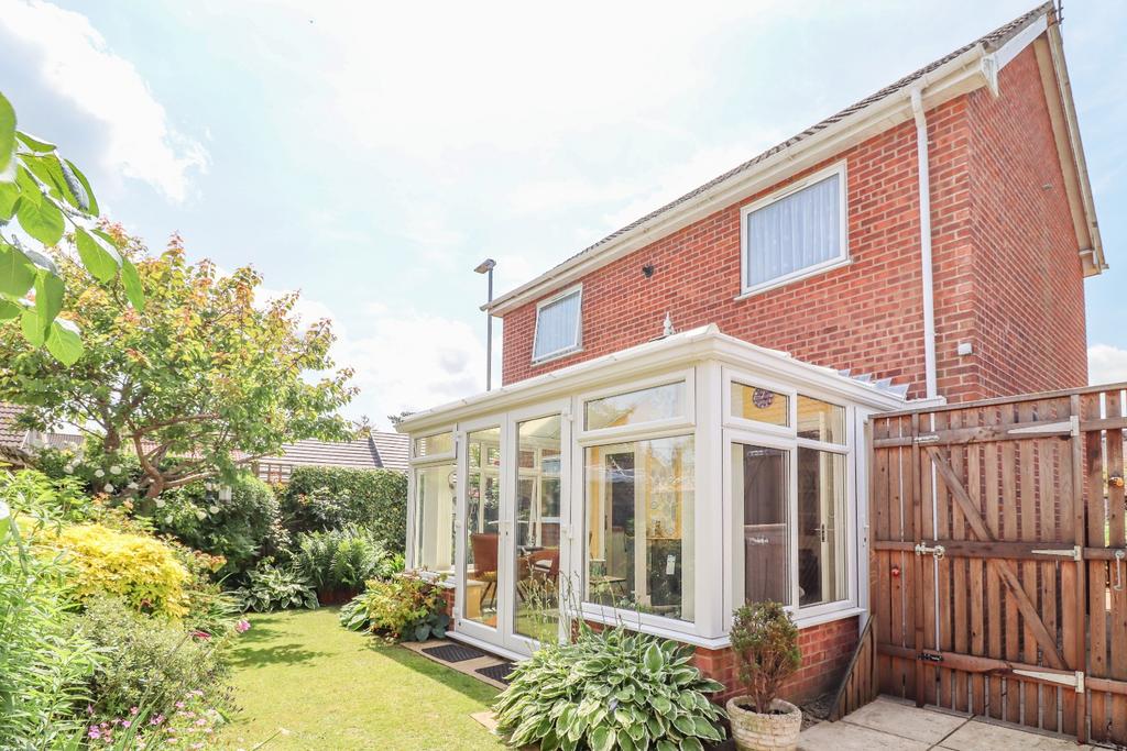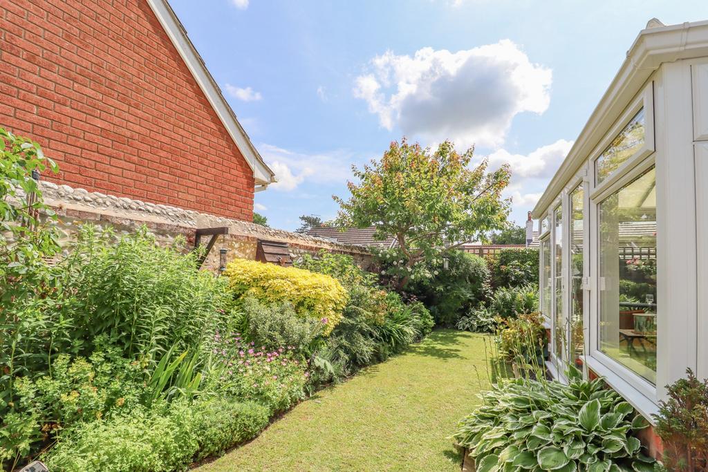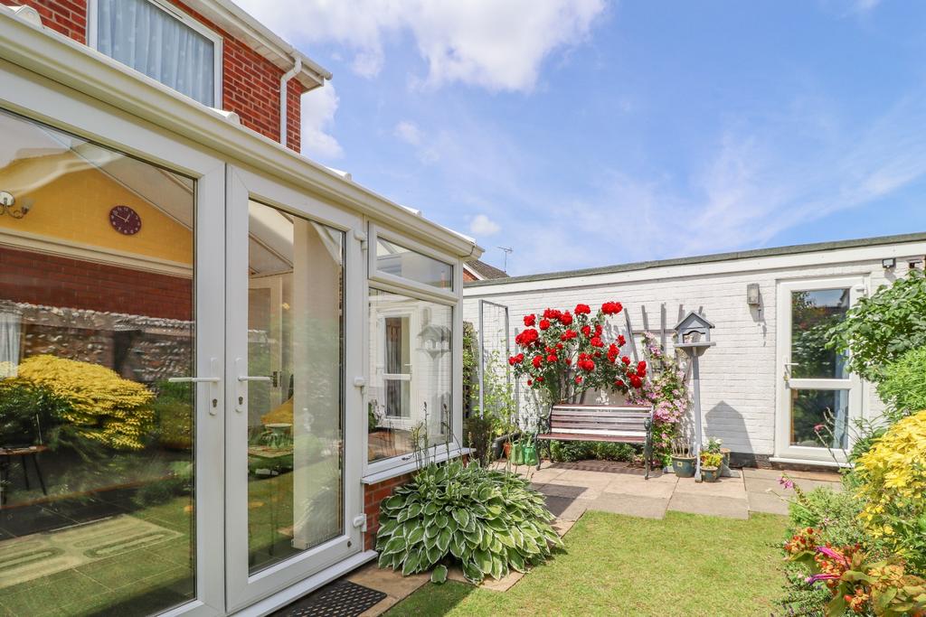 The rear garden is fully enclosed and enjoys a sunny south easterly-facing aspect, with a paved patio area, well managed lawn and mature borders—ideal for outdoor dining and family enjoyment.