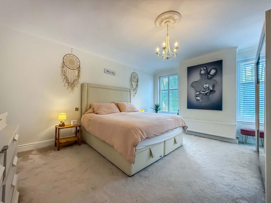 Two Upvc double glazed windows overlooking the rear garden with attractive plantation style shutters, door to useful built in cloaks cupboard incorporating hanging space. A separate door provides access to en suite shower room.