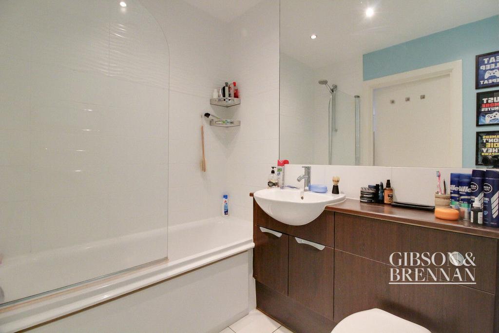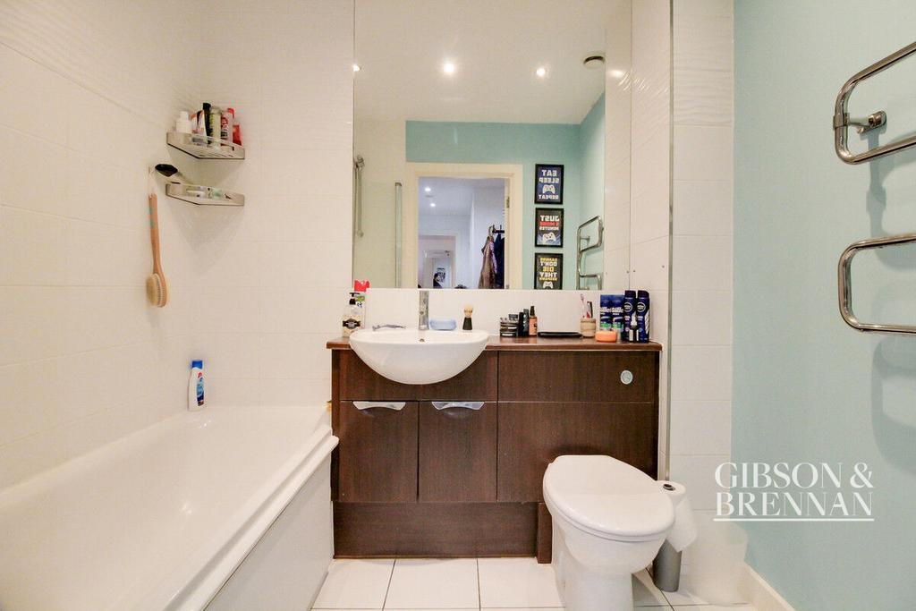 Three piece suite comprising of a low level wc, wash hand basin inset vanity unit and panelled bath, part tiled walls and tiled flooring, heated towel rail, smooth ceiling.