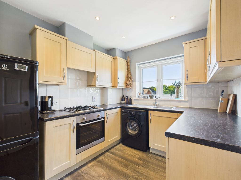 The kitchen is well-appointed with a range of eye and base level units, a four-ring gas hob with extractor, electric oven, and space for both a fridge/freezer and washing machine.