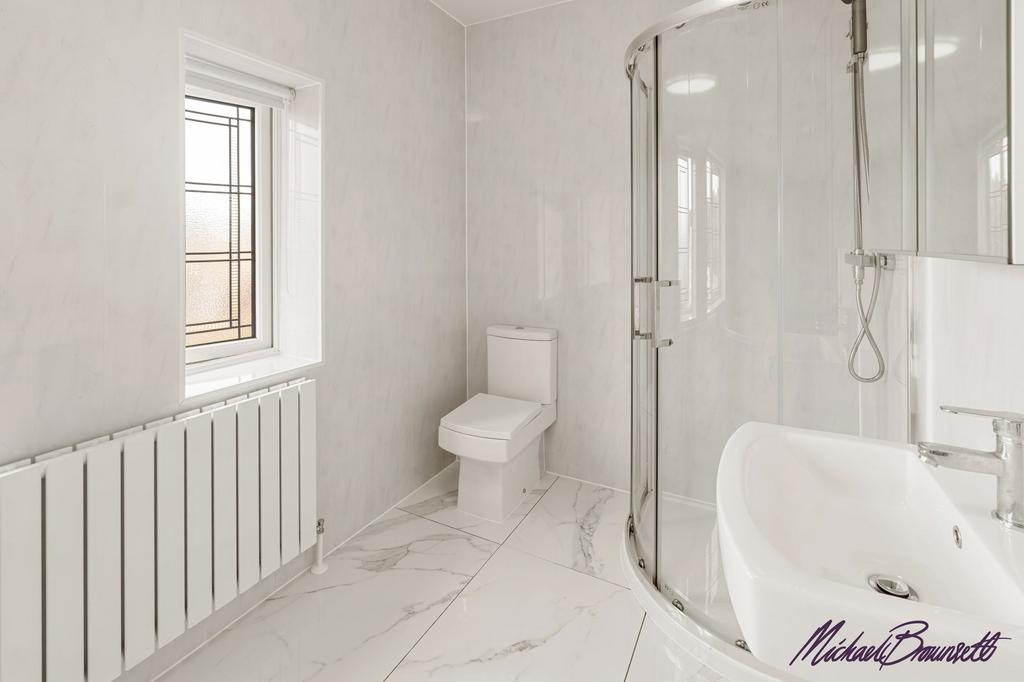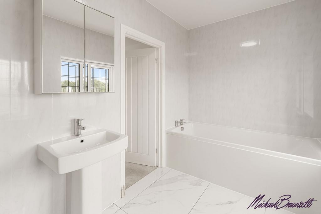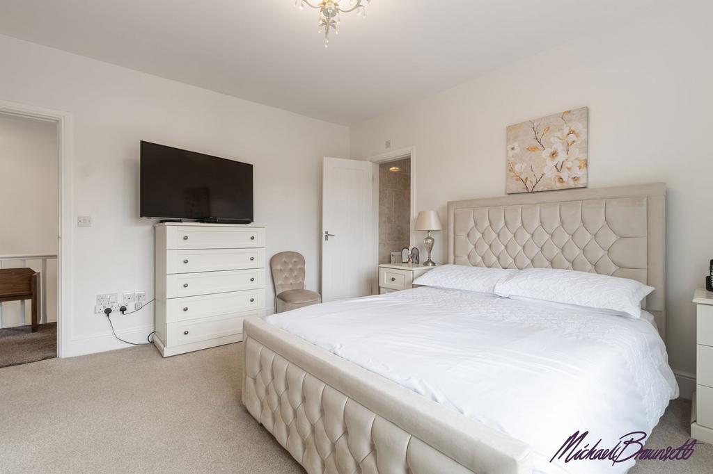 Upstairs, the principal bedroom suite is an exceptional space, offering refined comfort on a grand scale. This private retreat features ample room for both sleeping and lounging, as well as a stunning four-piece en-suite bathroom with high-end fittings and tasteful finishes. Three further bedrooms on this level are all double in size, two of which have built-in storage and Bedroom 3 benefitting from its own stylish en-suite shower room. A contemporary family bathroom, also with a four-piece suite including separate shower and bath, completes this beautifully designed upper floor.