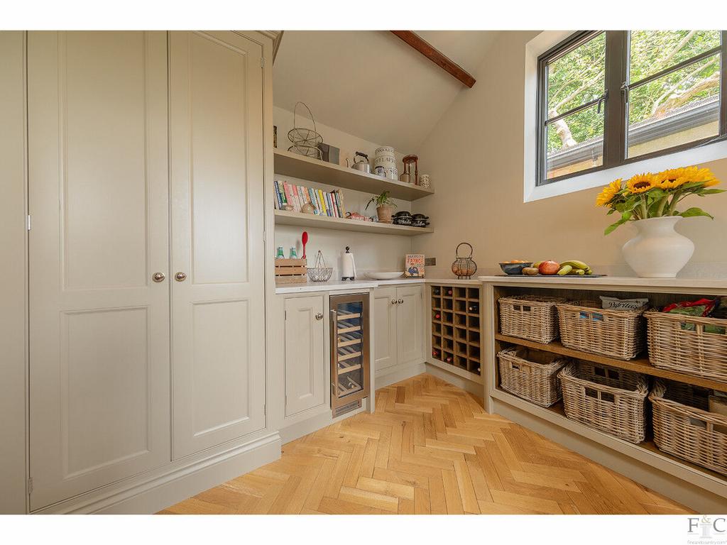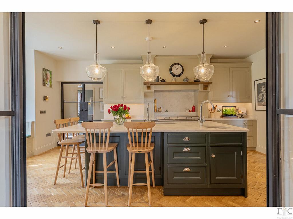The heart of the home is the striking open-plan kitchen, separated by Crittall-style glazed doors and fitted with bespoke Fraser James cabinetry, honed quartz worktops, and a generous central island. The kitchen includes a discreet butler’s pantry, Everhot range, and high-spec appliances, with a charming window seat offering views to the garden. A spacious utility room sits adjacent, seamlessly balancing practicality and style.
