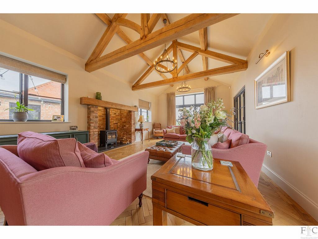 - Vaulted triple-aspect lounge with exposed beams, wood-burner, and garden views