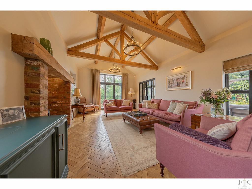 Beyond, a vaulted, triple-aspect lounge with exposed king trusses and parquet flooring offers a relaxed yet refined living space, anchored by a wood-burning stove in an exposed chimney breast. French doors open directly onto the south-facing garden, framing far-reaching countryside views. A separate garden room with mosaic flooring and wraparound glazing serves as a formal dining area, connecting beautifully with the outdoor entertaining terrace.
